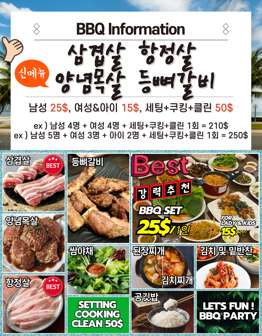 | BBQ 세트 | 삼겹살, 항정살, 양념 목살, 소시지, 채소 | 남성 $25 / 여성 & 어린이 $15 (1인) |